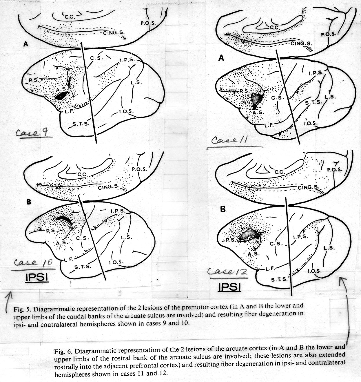 実験にはネコとサルを用いました。大脳皮質連合繊維の構成について執筆の依頼を受けて、日本語で総説をまとめました(1974, 1977)。ゲッチンゲンのクロイツフェルト先生から英語で書けという手紙がきました。有名なヤコブ・クロイツフェルト病のクロイツフェルト博士のたしか孫に当たる先生で、マックスプランク研究所の生理学の教授で所長をされておられた方です。クロイツフェルト先生が書かれた「大脳皮質」というドイツ語の教科書に私の模式図をたくさん載せてくれました。英語版も刊行されました。われわれの所見を含めて、当時発表されていたすべての知見を調べて検討しました。