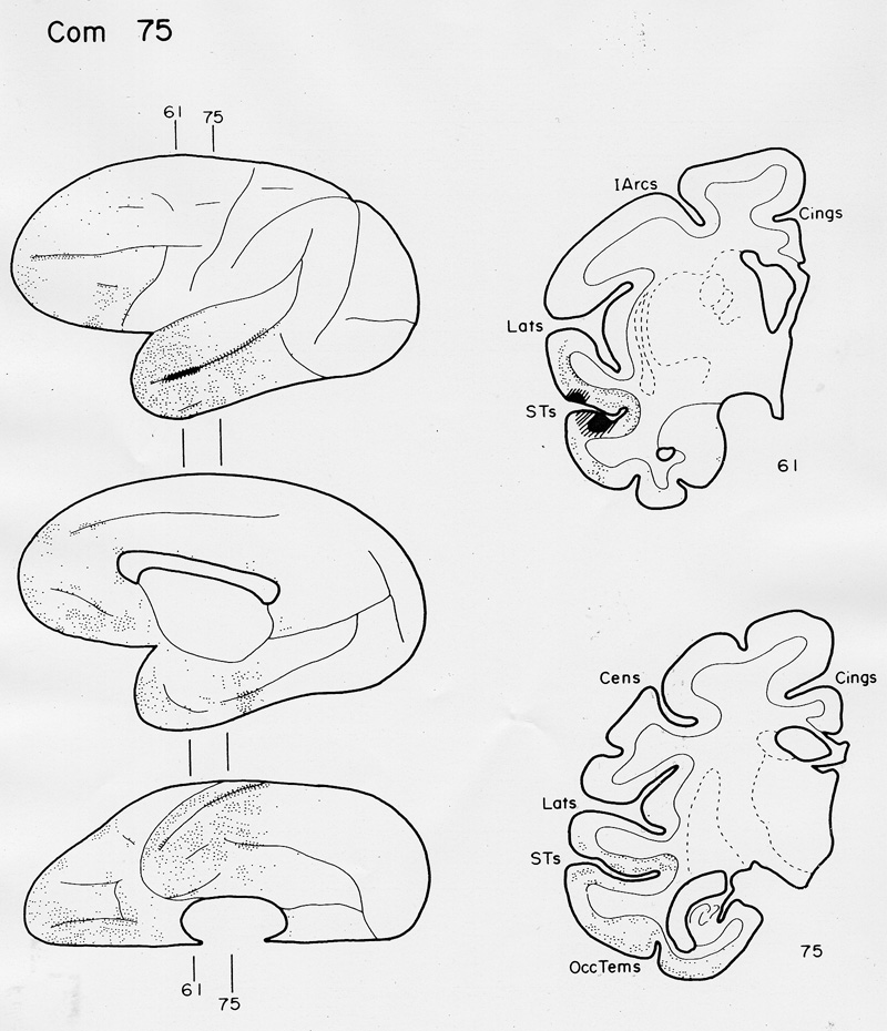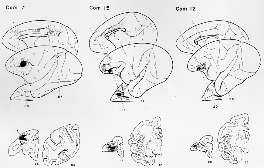 これはネコの外側面の写真で、皮質の一部に熱を与えて小さな傷をつけ、1週間後にWaller変性の現れる範囲を連続切片上で観察する。それで何がわかるかというと、傷を与えた領域から起こる神経細胞の軸索、つまり連合繊維の広がりを研究できるわけです。皮質皮質間結合の構成(organization)についての研究です。この研究にFink-Heimer法とNauta法を用いました。