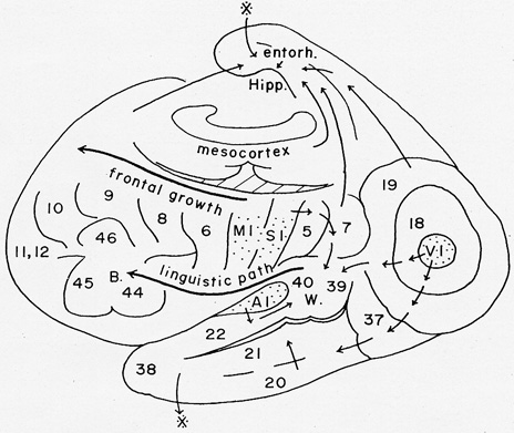 図18:ヒトの皮質連合野の段階的発達を示唆する想像図(川村、1977)