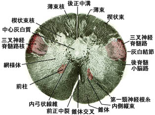 延髄下部の背側面にある薄束結節および楔状束結節のなかにある灰白質で、あわせて後索核という。体幹、四肢の深部知覚を伝える薄束と楔状束の終わるところで、内側毛帯の起こるところである。