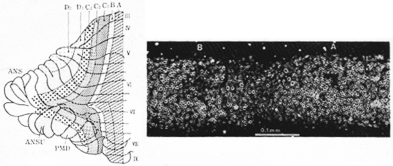 の名称を与えた。この帯域のあるものはさらに分けられた。(図1のシロイタチのHaggquist髄鞘染色による上の正常標本と、左の模式図をみよ)。彼によれば、白質は皮質求心性の小径線維束("raphe")と皮質遠心性の大径線維束の交互に帯状に並んだ集団からなる。そして、ある種の求心性(または遠心性)の結合はある特定の帯域に終わる(または、から起こる)。この原則は生理学的研究によっても確かめられた。すなわち、Armstrong,