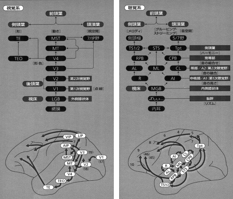 聴覚系でも後連合野から前頭前野への流れに上下(背側および腹側)の神経路があり、それぞれ、「どこか」と「何か」の機能が認められています(Romanski ら, 1999; Kaas と Hackett, 1999)。「背側の流れ」および「腹側の流れ」の概念は、もともと、後連合野内の興奮の伝達経路に対応して用いられたものですが、次のステップである前頭前野へ向かう経路をも含めてより広く考察することができます。さらに拡張すれば、前頭葉で「処理」された情報が、同じ背側と腹側の流れを通って逆方向に、前連合野から後連合野へと伝わる経路もこの言葉に含められます。視覚および聴覚の領野のブロック図と大脳皮質内の興奮の流れについては(図2)。